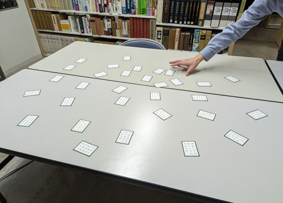後半は日本文学科の本拠地である2号館7階の閲覧室で、ジュースとお菓子で懇談する時間を持ちました。また、フロアのいろいろな場所にとり札を散らし、それを探す「アクティブ百人一首」を行いました。こちらもチーム対抗戦で、それぞれのグループが作戦を立てて臨んでいたようです。 |