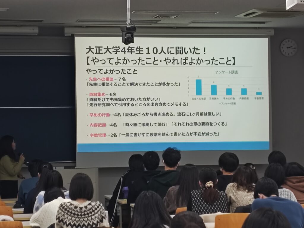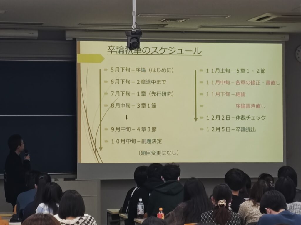 1月9日(木)13時20分から、日本文学科では卒業論文報告会を実施しました。この会は、卒業論文を執筆した4年生が3年生に体験談を伝えるために実施しています。これから卒業論文を書く3年生にとっては、先輩のお話を聞く貴重な機会です。当日は卒業論文の内容についても紹介されていますが、今後別に発表をする可能性もあるため、ここでは後輩へのアドバイスをご紹介します。