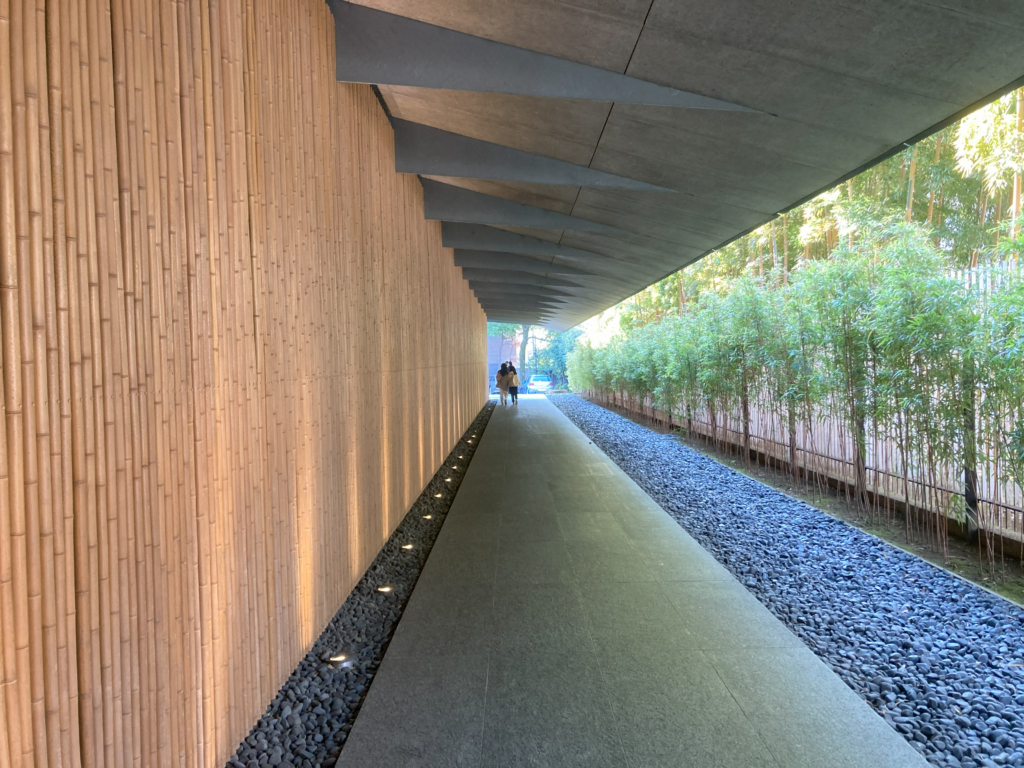 (2)根津美術館に関する体験記![]() 【入口にいたる通路の様子】学生による撮影 ・根津美術館では、入口の『如来坐像頭部 天龍山石窟第16窟(石造、中国・北斉時代、6世紀)』がとても気に入った。私は像に対する造詣が深くないのでなぜこの作品に惹かれるのかを考えたところ、他の像は正面を向いているのに対してこの像は下を向いているので高さの都合上表情が見やすく、親しみやすいからだということに気がついた。古筆切の展示では「料紙」という単語を学んだ。個人的には大きな金箔の入った砂子の料紙と破継が綺麗だと感じた。手鑑は紙が色紙のように厚く丈夫そうだと思った。また、古筆見という鑑定家がいることを初めて学んだ。今回の展示の中では『上東門院彰子菊合残巻(十巻本歌合)』、清巌宗渭、狩野探幽の字が読みやすいと感じた。古筆切の展示の中には、和古書の整理の際に頻出した西行や古典文学の中に登場した藤原公任、紀貫之等の有名な人物の名前がよく出てきたので、飽きることなく見学することができて楽しかった。(2年生) ・根津美術館では古筆切の固有名称の由来やその作品の解説があり、大変勉強になりました。『古今集』『伊勢集』『斎宮女御集』など大学で学んだ作品やゼミの人が卒論で扱った作品がありました。今では詞書は和歌に対して二字下げというルールがありますが、古筆切の展示を確認すると、今とは違った字下げが見られ、徐々に書き方の決まりのようなものができていったのではないかと思いました。また、個人的に一行書の展示が印象に残っています。書道を習っているので、どのような筆の繋がりがあるのか、バランスや筆の動きなど書き方に惹かれるものがありました。実際に展示を見ながら、遠くから指でなぞるようにして文字の繋がりを考えたり、文字のバランスの芸術性を感じたりと、楽しみながら見ることができました。一行書は迫力のあるもの、古筆切は書いた人によって文字の太さや書き方は異なりますが、文字の繊細さや一行書とは違った芸術性を感じ、双方の展示の良さと違いに気付くことができました。(4年生) ・古筆切の展示でしたが、所々にコラムとして用語の解説があり、勉強になりました。古筆家の歴代の極札が展示されていましたが、何代も同じ極が行われていて、さらにその極札が大切に残されているのは興味深く感じました。また、定家筆の『奥入』も展示されていて、キャプションを見ると、作品名やどの巻の切なのか判明したのが最近と書いてあり、驚きました。物語を研究している側からすると切られてしまうのはもったいないとも思いますが、古筆切にしかない作品があることを考えると夢があって面白いと思いました。(修士2年) ![]() 【庭園の様子】学生による撮影 |