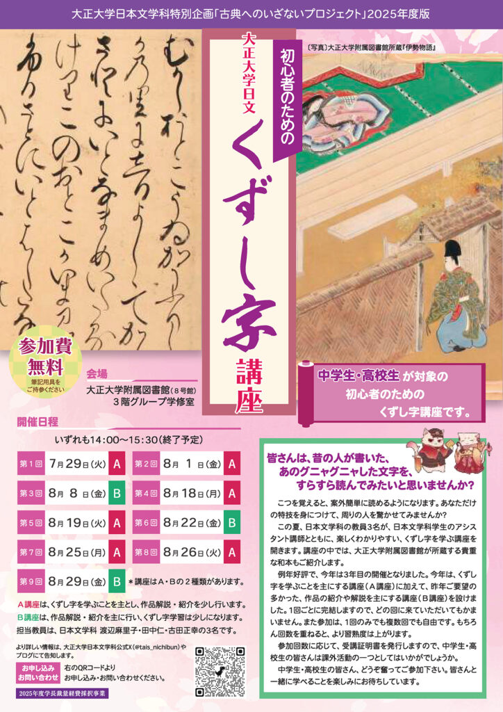 | 【参加費】無料(要申し込み、筆記用具をご持参ください) 【対象】中学生・高校生 【開催時刻】各回原則として14時~15時30分を予定しています。 【場所】大正大学附属図書館3階グループ学修室 【日程】 第3回 8月8日(金) B講座 第4回 8月18日(月) A講座 第5回 8月19日(火) A講座 第6回 8月22日(金) B講座 第7回 8月25日(月) A講座 第8回 8月26日(火) A講座 第9回 8月29日(金) B講座 *A講座は、くずし字がメインで作品解説・紹介を少し行います。B講座は、作品解説・紹介がメインで、くずし字学習を少し行います。 *講師は都合により変更になる可能性がありますが、1~3回は渡辺麻里子先生(日本中世文学)、4~6回は田中仁先生(日本近世文学)、7~9回は古田正幸先生(日本中古(平安朝)文学)が務める予定です。 【お申し込み・お問い合わせ】 上チラシのQRコード、もしくは、こちらのリンクからお申し込みください(移動先はGoogleフォームで、どちらから移動してもかわりません)。 予定の変更などがあった場合は、本ブログや、日本文学科公式SNSアカウントから発信します。 大正大学文学部日本文学科では、これからも様々なイベントや取り組みを行っていく予定です。日本文学科公式SNSアカウントにおいて、情報発信をしていますので、良かったらフォローや拡散のほど、よろしくお願いします。 ◎本企画は、2025年度学長裁量経費採択事業として実施します。 |