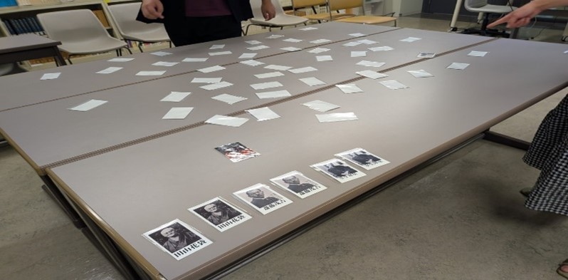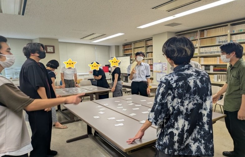 第1Q、第2Qが終了した7月24日(木)、近代文学ゼミでは3、4年生の有志が集まって、ゼミ終了後にお楽しみ会を開催しました。 ジュースとお菓子をお供に歓談し、4年生が作成したゲームを行いました。ゲームは「文豪神経衰弱」で、順番にカードをめくって、2枚1セットになった文豪の写真を探すもので、意外に難しくゲームは大盛り上がりでした。ひとしきりゲームを楽しんだ後、この「文豪神経衰弱」がどんなふうに作成されたかを聞きました。選定された文豪は4年生たちが卒業論文で扱う作家を中心にしており、写真もみながお気に入りのものを選んで作成したそうです。こんなところにも、4年生たちの卒論への思いが感じられ、心が温かくなりました。 ![]() 【文豪神経衰弱の様子】 |