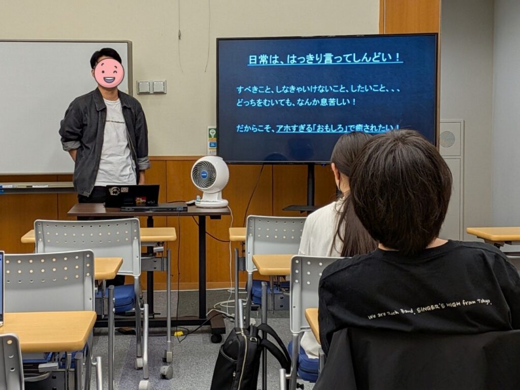 参加しての気づきとしては、授業で毎週のように会っていても、互いの好きなものについて話をする場は意外にないなというものでした。みな、本当に楽しそうに自分の好きなものについて語ってくれ、こういうところから新たな仲間の輪が広がるのだなと感じました。第2弾、第3弾につなげ、もっと大きな輪を作っていきたいです。 |