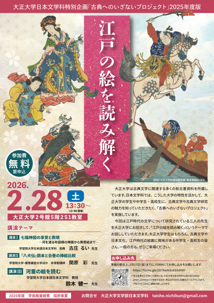 | 期日:2026年2月28日(土)13時30分~(13時開場) 会場:大正大学2号館5階 251教室 参加費:無料(資料印刷の都合上、2月27日(金)までに要申込) 申込:上記のチラシQRコードもしくは下記URLからお申し込みください。 https://forms.gle/2D7XoiAiZuEb5dH87 企画の趣旨: 大正大学は古典文学に関連する多くの和古書資料を所蔵しています。日本文学科では、こうした大学の特性を活かして、大正大学の学生や中学生・高校生に、古典文学や古典文学研究の魅力を知っていただきたく、「古典へのいざないプロジェクト」を実施しています。 今回は江戸時代の文学について研究されている三人の先生を大正大学にお招きして、「江戸の絵を読み解く」というテーマでお話ししていただきます。大正大学学生はもちろん、古典文学や日本文化、江戸時代の絵画に興味がある中学生・高校生の皆さん、一般の方も、ぜひご来場ください。 |