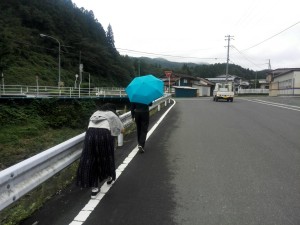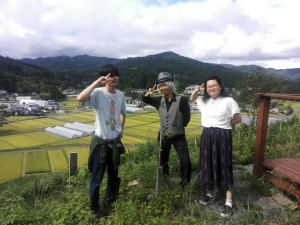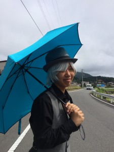 2班はいりやど近辺の東屋、田んぼ、八幡神社へロケへいきました。白髪のかつらを被って、晴天の下青い傘をさすという撮影は、近隣の方々の目を惹き、沢山の地元の方々から声をかけていただき、コミュニケーションを取ることができました。