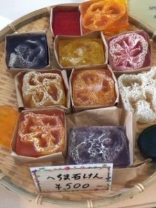 収穫物の一部は朝市や巣鴨の商店街で大正大学学生が運営するアンテナショップ「座ガモール」でも販売していますが、それ以外にも関連した新商品の開発にも挑戦しています。例えば、「ヘチマ入りアロマソープ」はその一例です。大学キャンパス内で作ったヘチマからたわしを作り、スライスしたヘチマたわしを入れたアロマソープを試作しました。こうして作った試作品を、さっそく12月の「朝市」で試験販売をしたところ、お客さんの反応は上々でした!