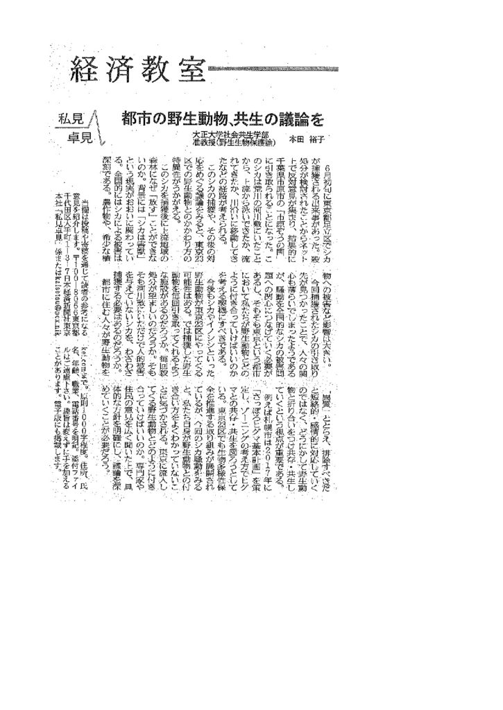 みなさん、こんにちは。久しぶりのブログ更新となってしまいました。本日は、みなさんの中で関心の強い「環境政策」、さらには「野生動物保護」についてのお話です。基礎ゼミナールⅠの終盤の授業でも触れていましたが、東京都足立区でシカが捕獲される出来事を覚えていますか?実は日本経済新聞(2020年7月16日付)に、本田裕子先生が「都市で野生生物と折り合いをつけ共存・共生していくこと」の重要性について述べられた記事が掲載されました。ぜひ、みなさんも読んでみてください。みなさんが感じたことを9月の講義の中で伺いたいと思います。