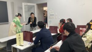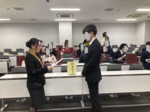 大学全体の卒業式のあと公共政策学科で集まり、お世話になったゼミの先生から一人ずつ学位記を受け取りました
