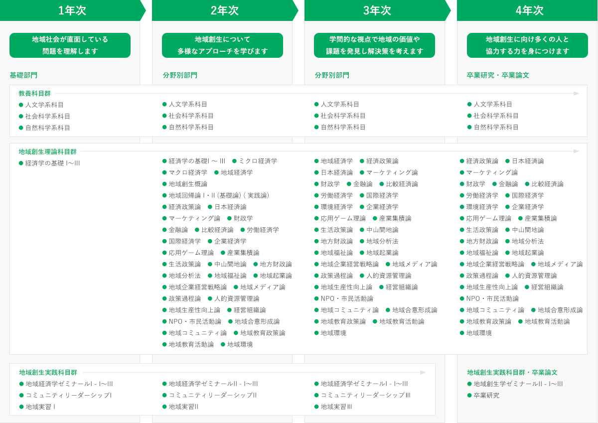 地元に戻って働きたい、新たなビジネスで地域を変えたい、NPOで人の役に立ちたい。それぞれの目標やスタイルに合わせて、自分だけの未来を描けるように地域社会について経済学・経営学の観点から広く学びます。