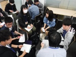2日目のガイダンスは自己紹介からはじまりました。地域創生学部はコミュニケーション能力が物を言います。次第に笑顔が出始めました。