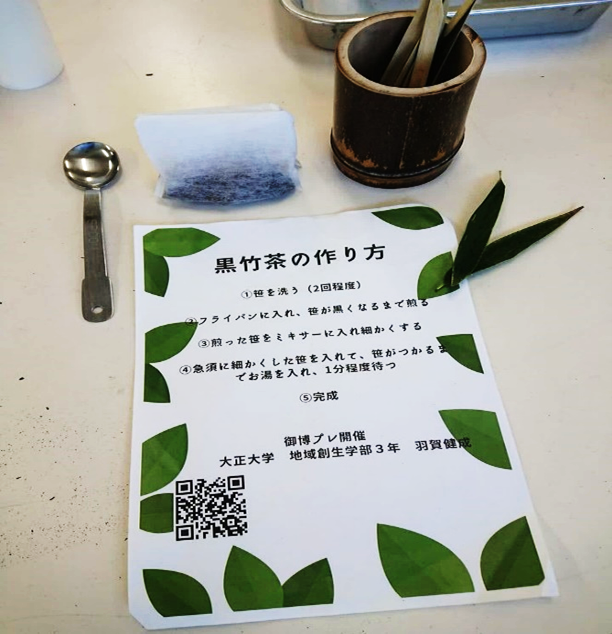3月9,10日に、御坊日高博覧会(通称おんぱく)で、地域創生学科3年生の羽賀健成君が、自ら開発した和歌山県日高町特産の黒竹の葉を使った黒竹茶のイベントを企画・実施しました。