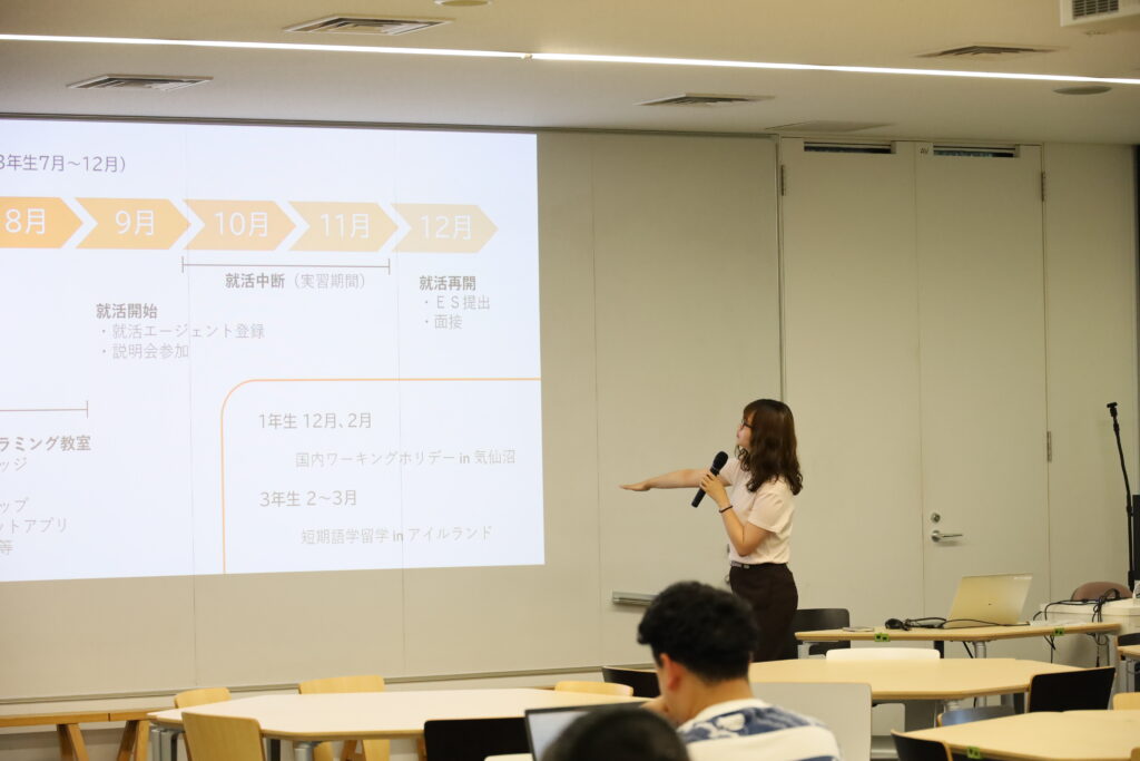 当日は、4人の卒業生を迎え、それぞれの就職活動に関して、準備の段階からどのようなプロセスで現在の就職先の企業から内定を得たのか貴重な経験を話してくれました。三者三葉という言葉通りで、全く同じプロセスはなく、目標だった企業から内定を得るためにどのように就職活動をしたのかといった話や、興味のある分野で活躍するためにスキルを学びそれを生かした就職活動など、どのようなことをすればいいのかわかりにくい現役学生にとっては、参考になる話が満載でした。特に、時系列に沿ってどのような活動をしたのかというのをプレゼンテーションしてくれた卒業生もいてより具体的にイメージできたと思います。