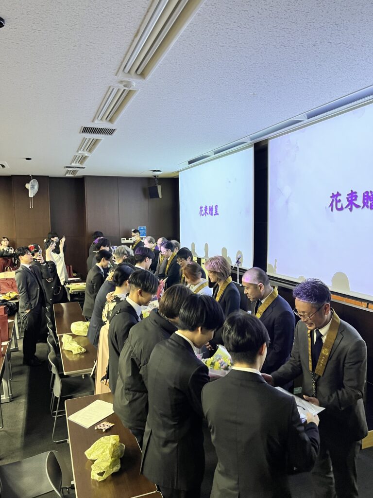 【ゼミ生からゼミ教員へ花束&ネーム入りマフラータオル贈呈】