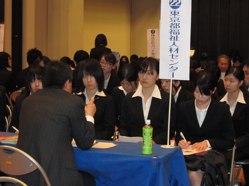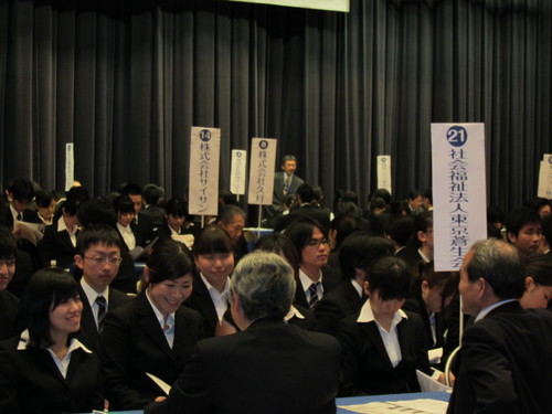 多くの一般企業に混じって、社会福祉施設を経営する社会福祉法人や介護事業系企業、それに東京都福祉人材センター(東京都社会福祉協議会)にもご参加いただきました。参加くださいました施設や企業の皆様ありがとうございました。社会福祉の学生も思い思いにそれぞれのブースを訪れ、理念や事業内容・募集状況に耳を傾けていました。