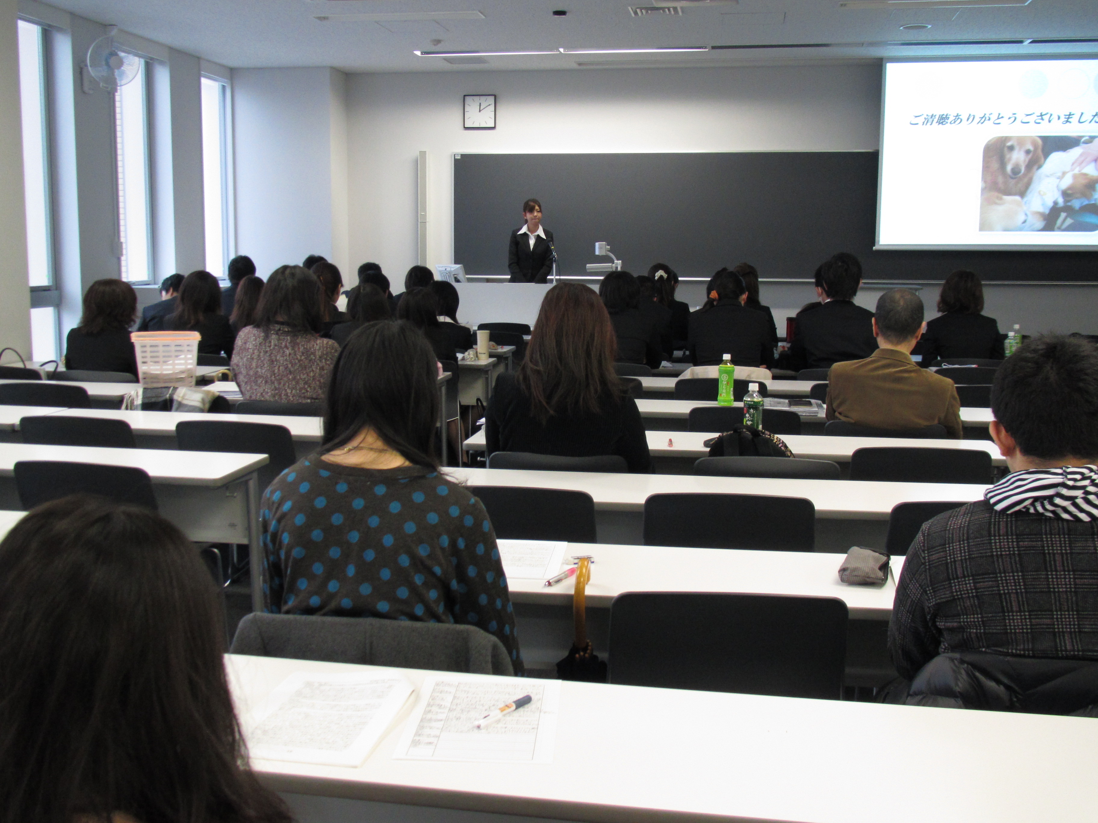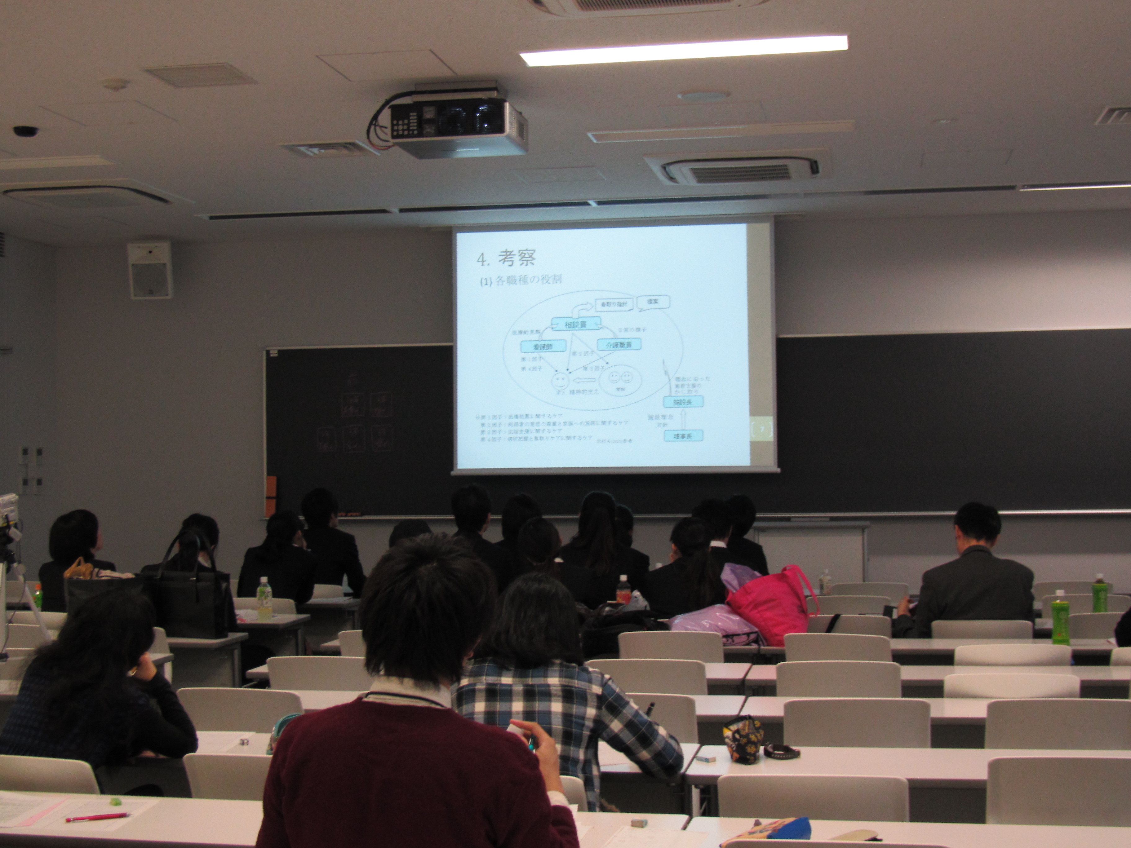 当日は、卒論卒研を提出した4年生60名が2クラスに分かれ、卒論卒研の概要をレジュメとパワーポイントを使って発表しました。発表後には、指導を受けたゼミの先生とはまた別の、副査の先生から質問や講評があるので、皆緊張した面持ちで発表に臨んでいました。来年度卒論卒研に臨む3年生も参加し、4年生の発表を真剣に聞いていました。