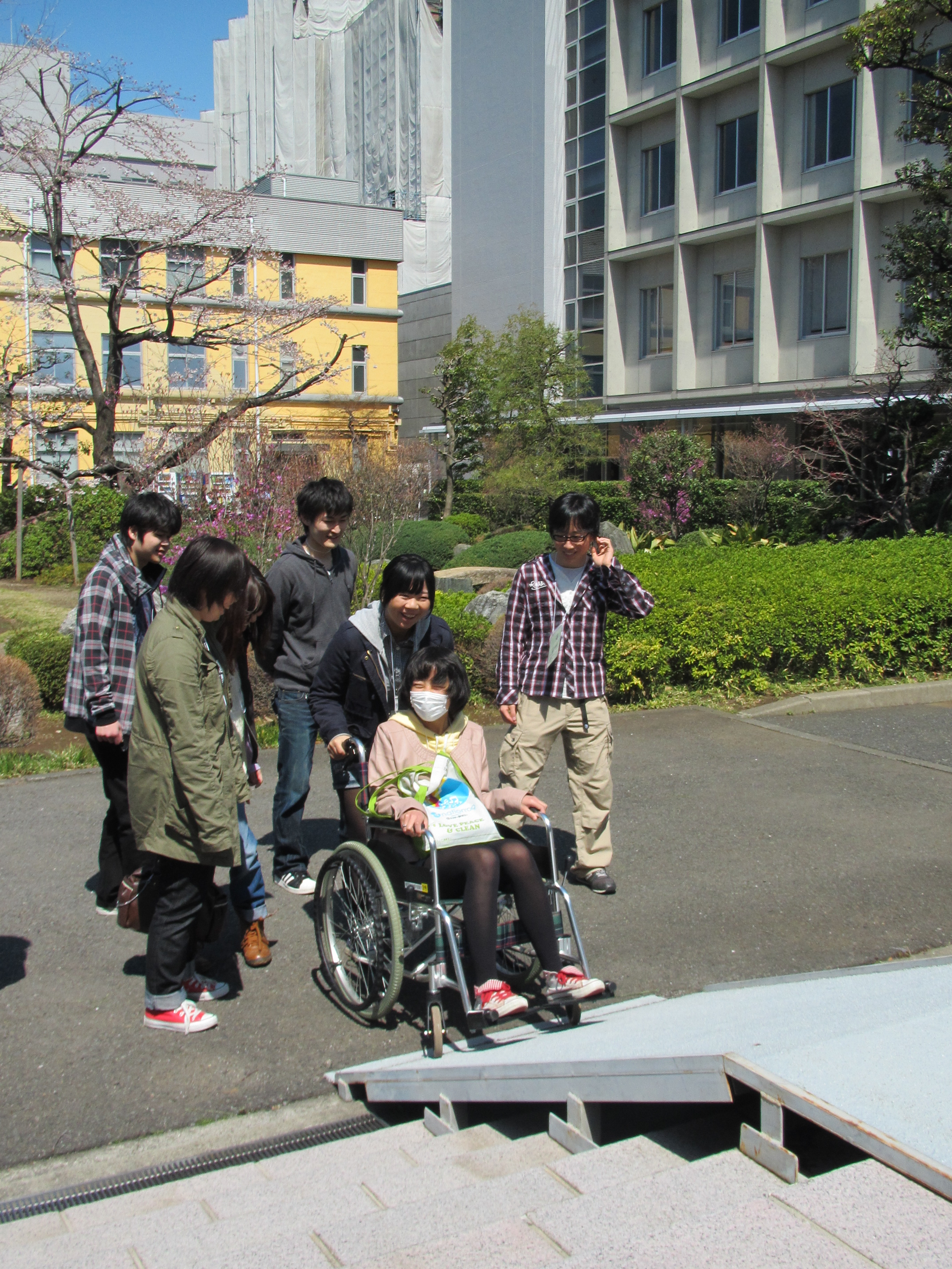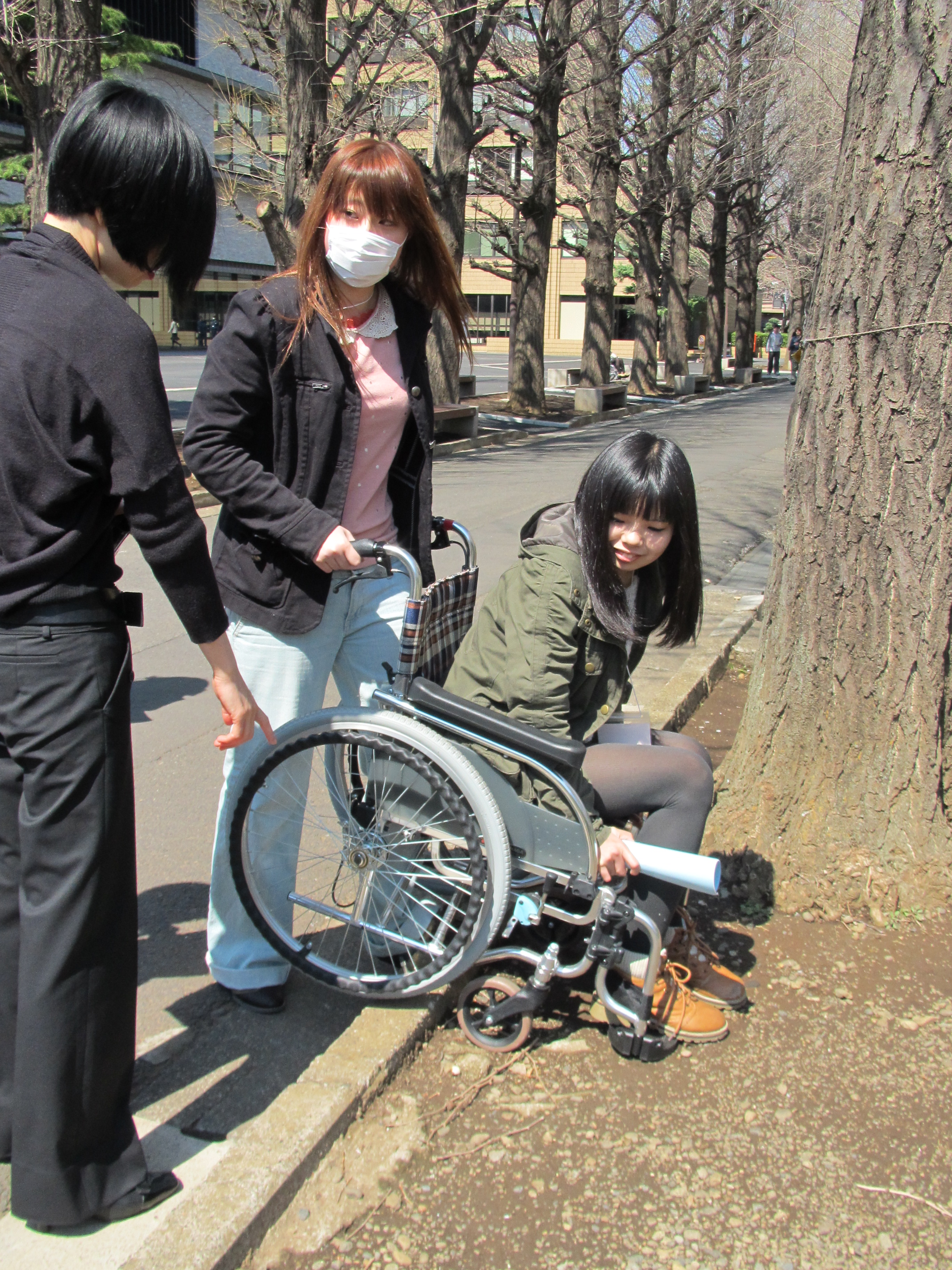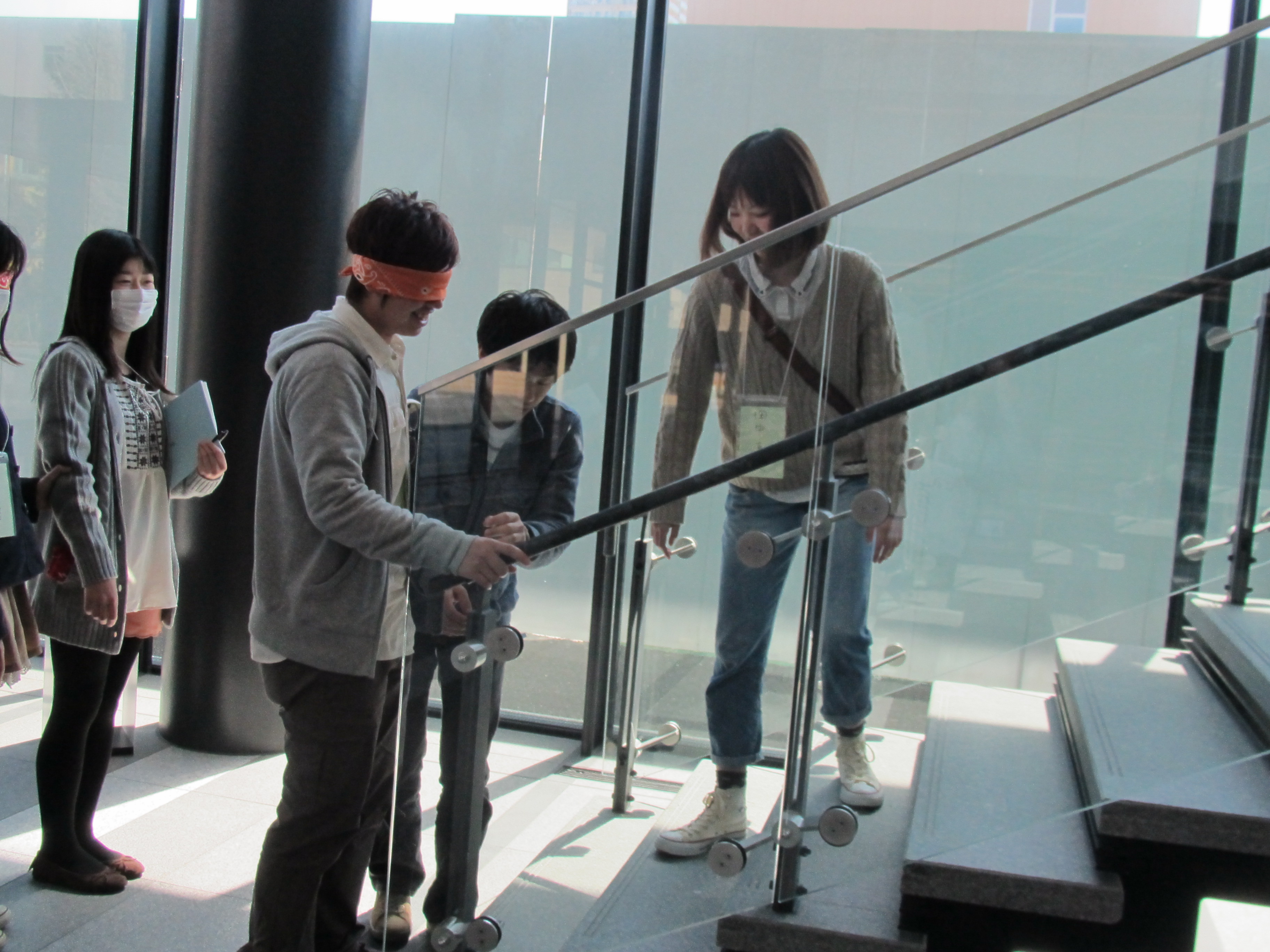 コミュニケーションを深めると言っても、やはり大学の授業の一環です。ソーシャルワークに関連する活動のなかで、コミュニケーションを深めていきます。当日は、当事者の立場、支援者の立場、双方の視点から考えるというテーマから、車椅子体験、ブラインドウォークをおこないました。