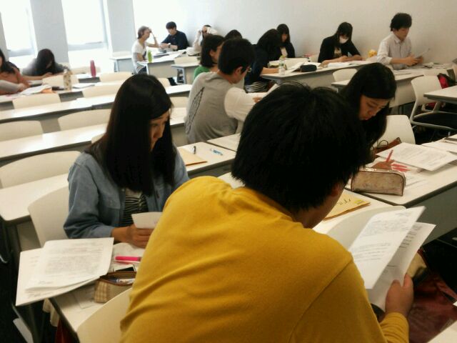 授業では、予習プリントを元に、間違っている選択肢をどのように書き直したかをグループで話し合います。自分とは違う見解や意見があれば参考にします。その後、確認テストがあり、授業の最後に次の科目の予習プリントが配布されます。これを繰り返します。