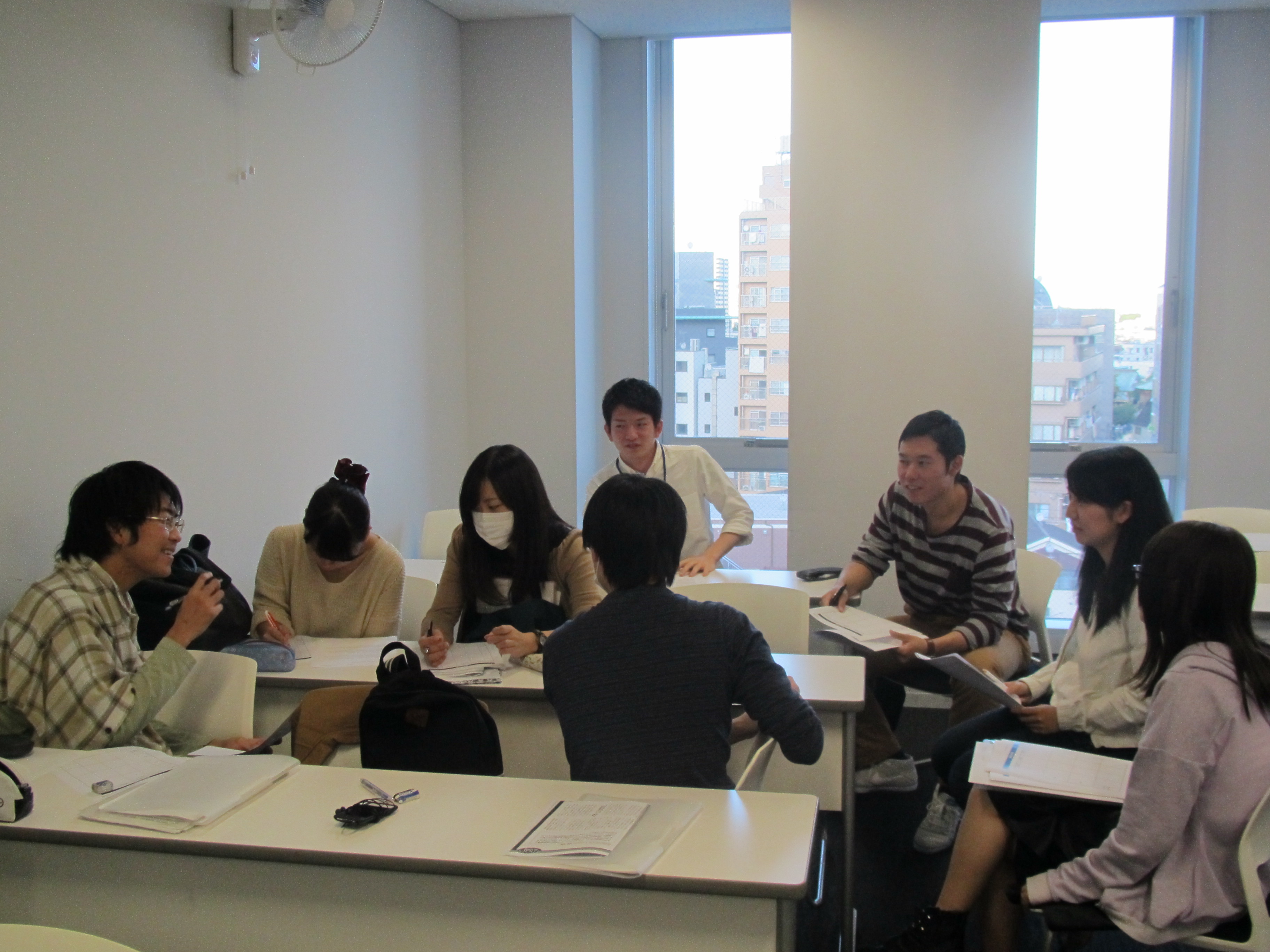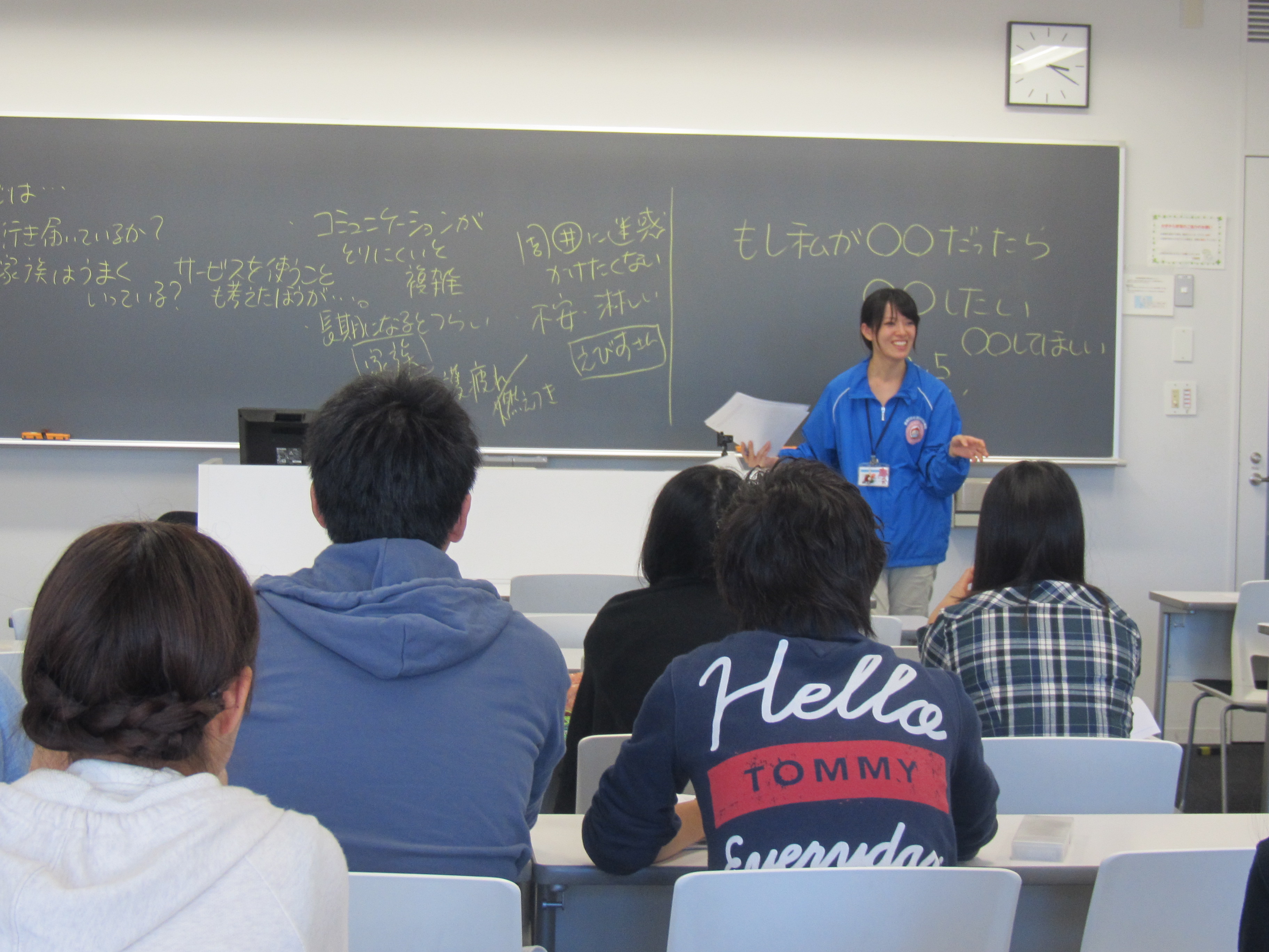 4つある基礎ゼミナールクラスの1つである沖倉ゼミでは、これまで7月~9月の夏期休業期間を通して、各自7~8回ずつ、区民ひろば千早のプログラムやCSWが取り組む地域活動、関係機関への見学などに、ゼミ生22名が分担して参加してきました。サービスラーニングは、このように基本的にはフィールドに出向き、そこで行われている活動に参加する方法を取ることが一般的ですが、試みの1つとして、10月14日(火)の4限目に、CSWの宮坂さんと森田さんにご来校いただき、『誰もが住み良い街を目指して~地域でできることを考える~』と題し、ゼミ生と一緒に、事例検討を行っていただきました。