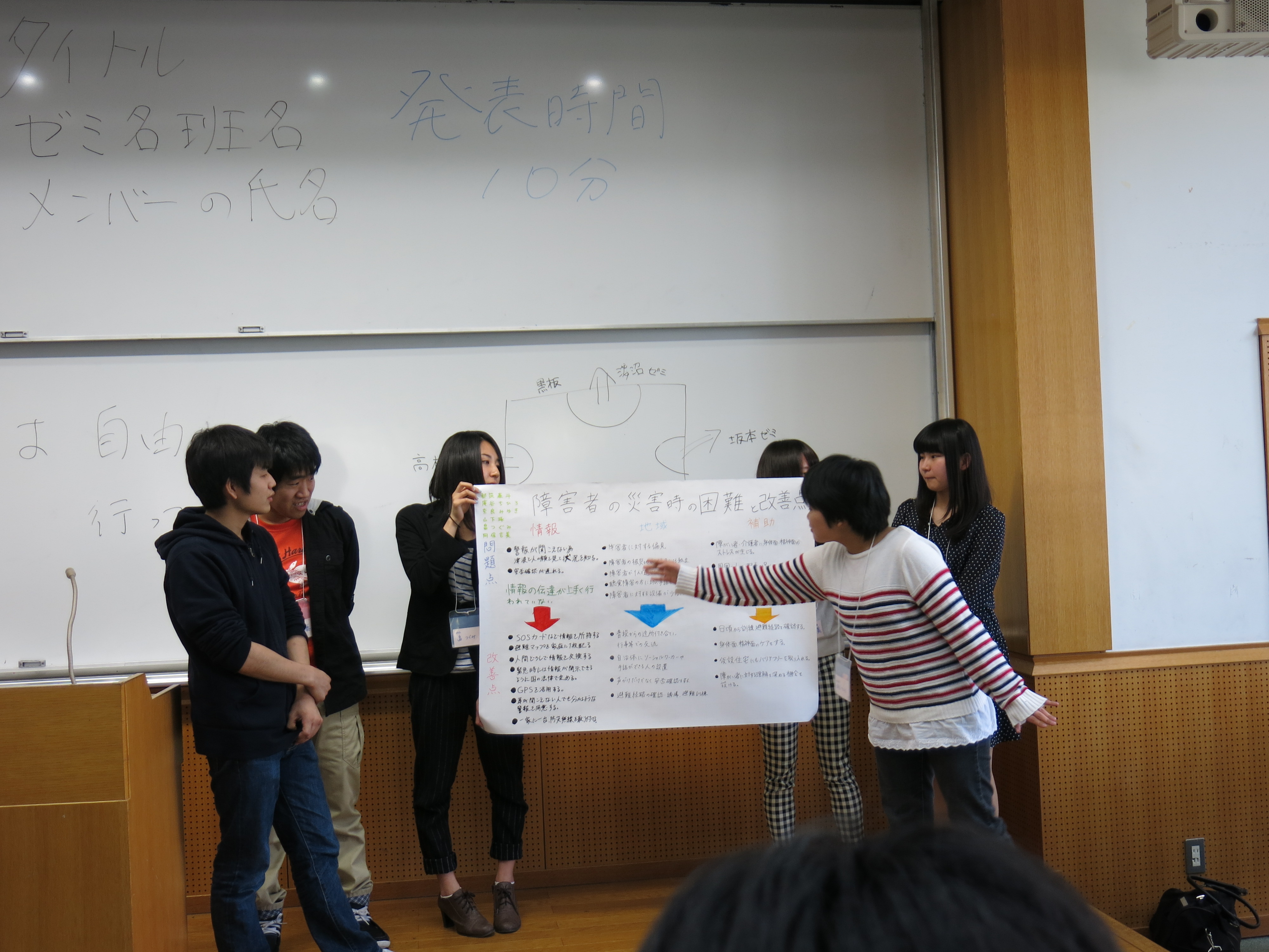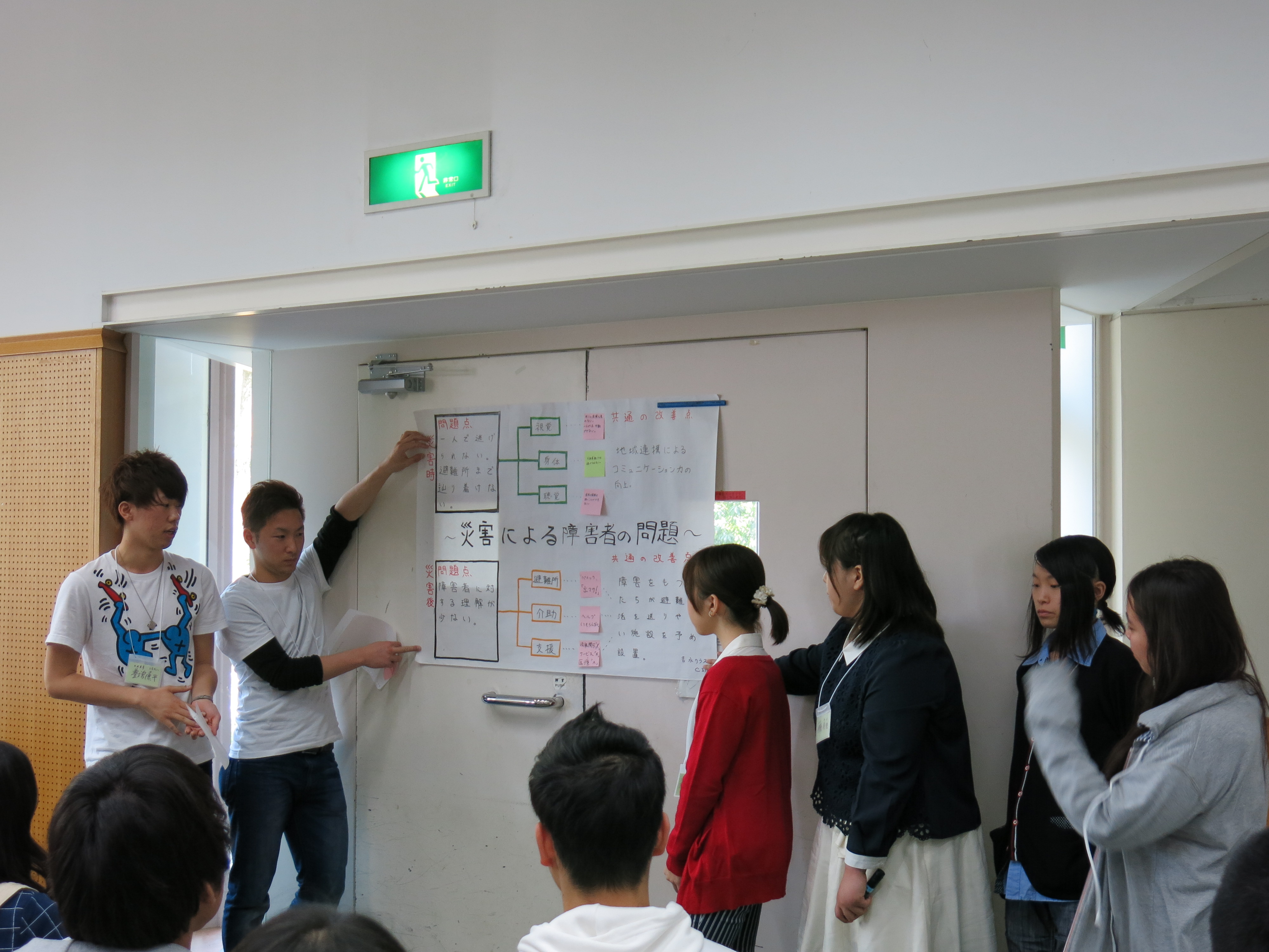 合宿の主な内容として、「生命のことづけ」という東日本大震災において障害者に焦点を当てた映画を鑑賞しました。その後、1年生はグループごとに分かれ、鑑賞した映画についての問題点、解決策、考察などをまとめ、発表に向けグループ学習をおこないました。