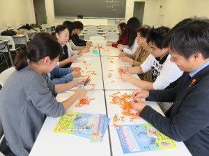 さらに今年は、豊島区更生保護女性会や民生・児童委員の方々にも授業でご協力いただき、一緒にオレンジリボンを作りました。