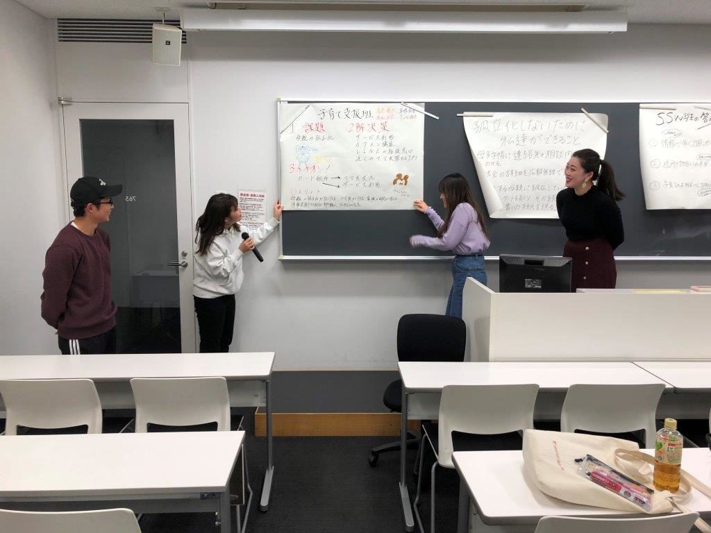 ワークショップでは、将来親となる立場の学生が、子育ての現状や課題を理解したうえで、今後どのような支援があるとよいのか、課題解決のためのアイデアをグループで検討し、改善に向けた提案を発表します。