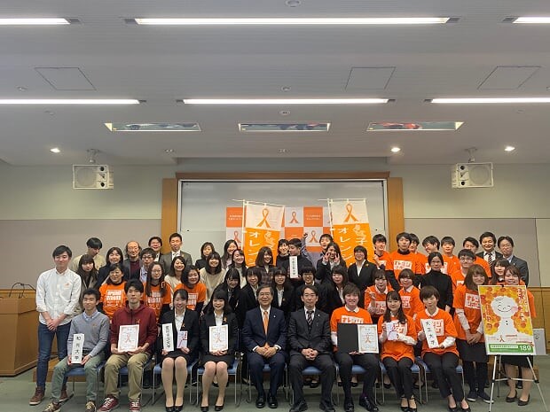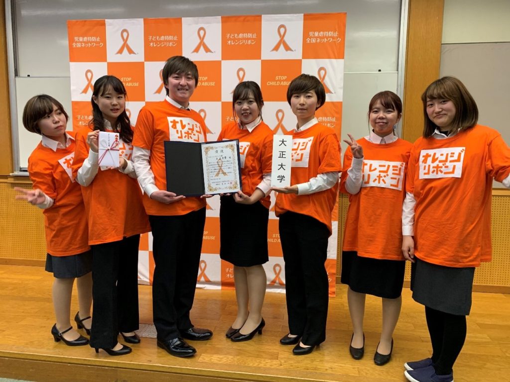 本学科のオレンジリボン運動の取り組みは、2013年度ソーシャルワーク演習Ⅰの授業に位置づけスタートし、今年度で6年目となります。大学生をはじめ地域住民に発信し、6年間継続してきたことが認められ、実に嬉しいことです。