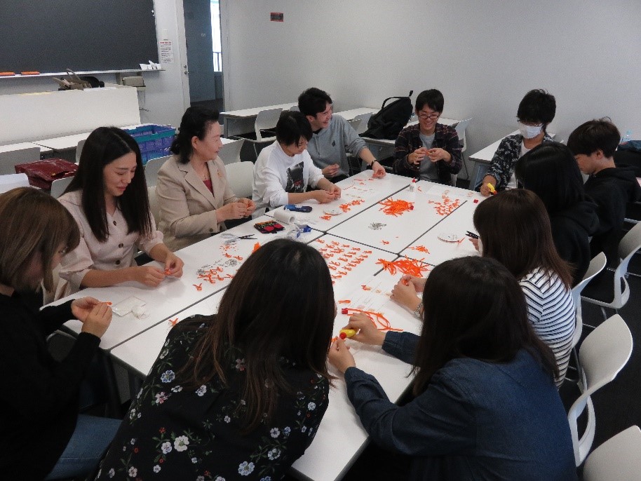 今年も豊島区子育て支援課や地域区民ひろば課と協働して取り組みました。豊島区更生保護女性会と民生・児童委員の方々が授業に参加し、学生たちにオレンジリボンの作成方法を丁寧に教えてくださいました。