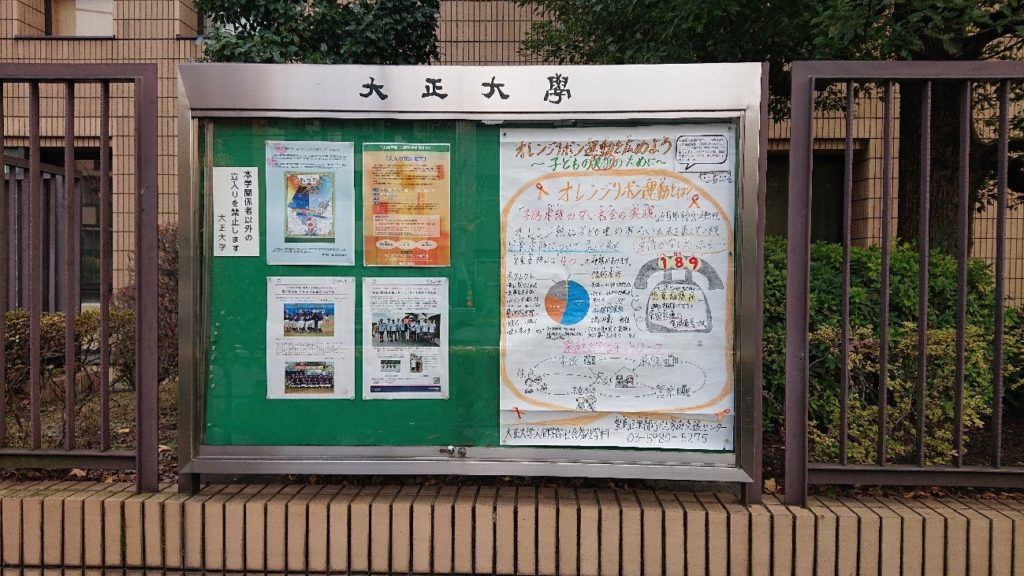 昨年から大正大学(明治通り沿い)の掲示板に、社会福祉学科2年生が作成したオレンジリボン運動のポスターを掲示しています。ご高覧いただけましたら幸いです。
