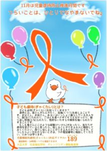 11月は、児童虐待防止推進月間です。皆さん、オレンジリボン運動のことを知っていますか?オレンジリボン運動は、「子ども虐待のない社会の実現」を目指す市民運動です。オレンジは、子どもたちの明るい未来を意味しています。