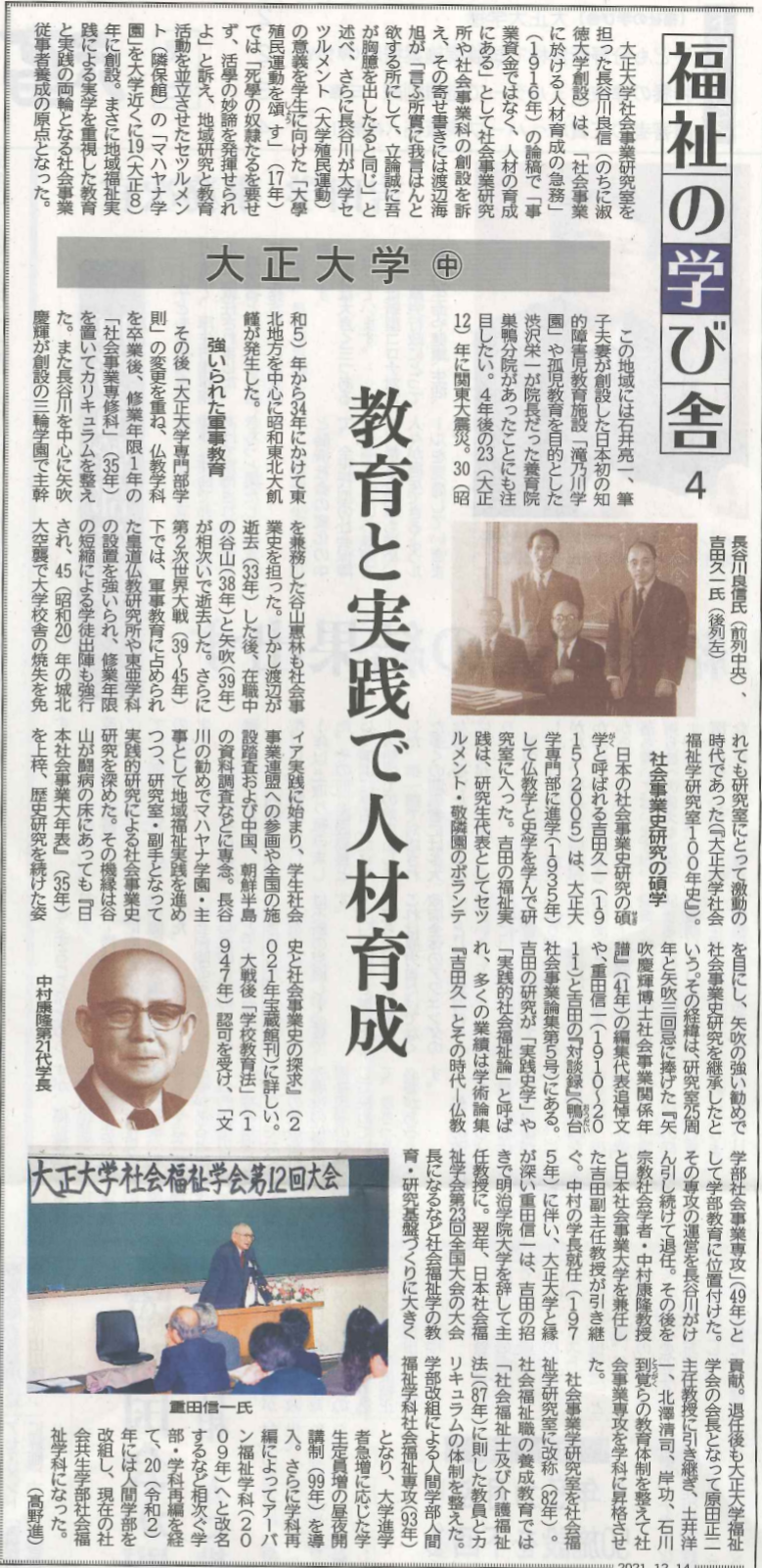 シリーズ①では、温故知新ということで現在の(下)を掲載しました。今回は、少し遡って(中)を掲載したいと思います。 現在の社会福祉教育の理念に通底している思想が大正大学社会福祉学科の100年の歴史から見えてくるのではないかと思います。 (文責:坂本智代枝)