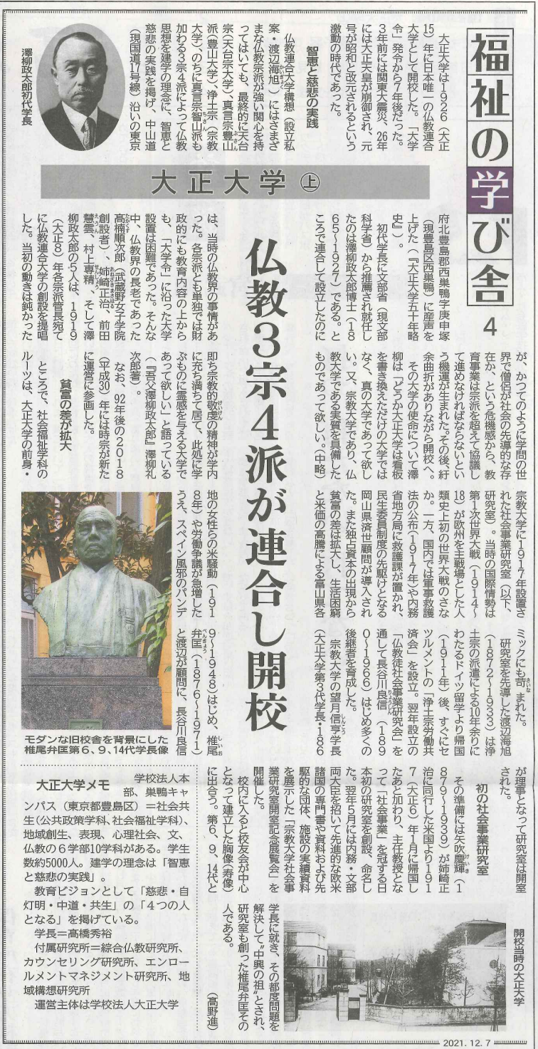 シリーズ①では、温故知新ということで現在の(下)を掲載しました。前回のシリーズ②では、少し遡って(中)を掲載しました。今回のシリーズ③は、大正大学の設立及び社会福祉学科の100年以上の歴史から学ぶことになります。 現在の大正大学の社会福祉教育の思想が100年前の歴史から脈々と引き継がれていることに気づくと思います。