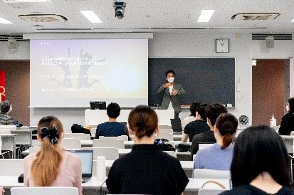 授業では、①今の社会が求める学生はどんな人物か ②私がチャレンジしてどんな変化があったか ③では自分たちが今日から何が出来るか の3部構成で「今日、知り・考えてもらいたい事」について話された。グループ対抗のゲームなども交えながら、内山さんと受講生のやり取りが活発に行われました。