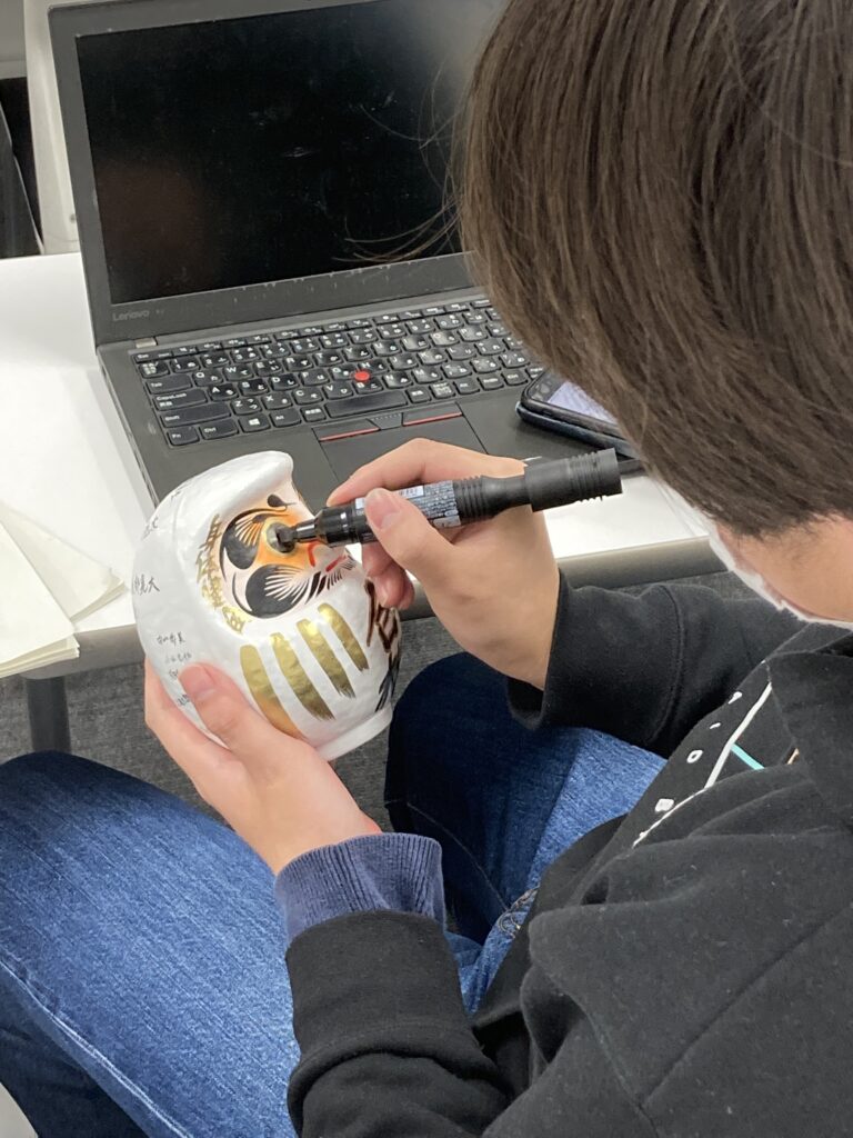 振り返れば、コロナ禍に翻弄されながらも、オンライン授業で一生懸命に学び続け、受験まで頑張った学生たちでした。無事に希望者全員が受験し終えたことをもって、合格「しろ」(白)だるまに学生たちが目を入れました。