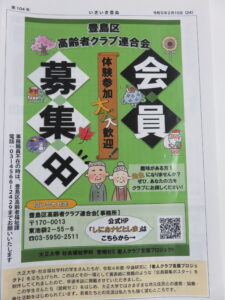 高齢者クラブ役員の皆さまが、この「会員募集ポスター」を大変喜んでくださり、豊島区高齢者クラブ連合会「いきいき豊島」104号(2023年2月15日発行)の裏表紙に掲載されることとなりました。