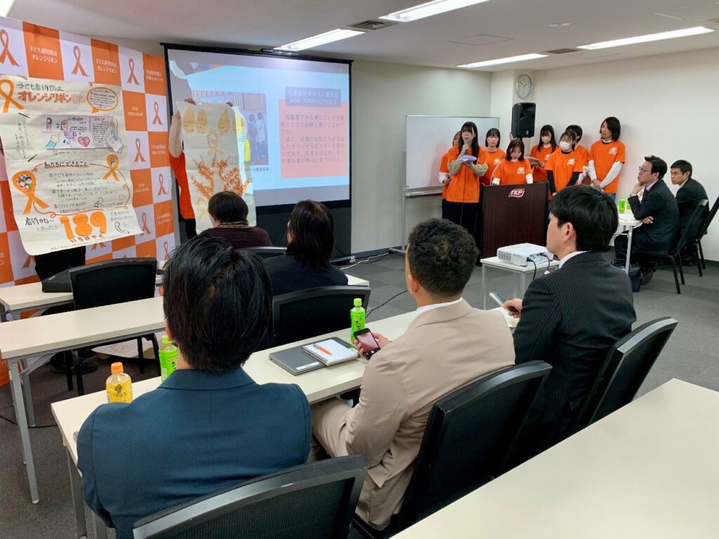 今年度は、基礎ゼミナールを履修する1年生、ソーシャルワーク演習Ⅲを履修する2年生、卒業研究に取り組む3年生がオレンジリボン運動に参加しました。今回の全国大会では、1年生から3年生の学生計10名がオレンジリボン運動推進隊代表として、「『つたえる』から『つたわる』、『つながる』へーオレンジリボン運動推進隊の実践を通してー」をテーマに報告しました。
