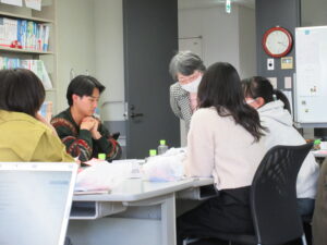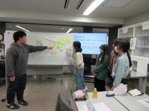 休憩を挟み、後半はグループワークです。今回のグループワークでは、本書の中で興味を持った話題について知ったことや学んだことは何か、これから社会福祉学科でどのような学びをしたいのかの2点。グループ内での各自の発表を行い、意見交換をし、付箋やシートを使ってグループ内での共通点を検討しました。