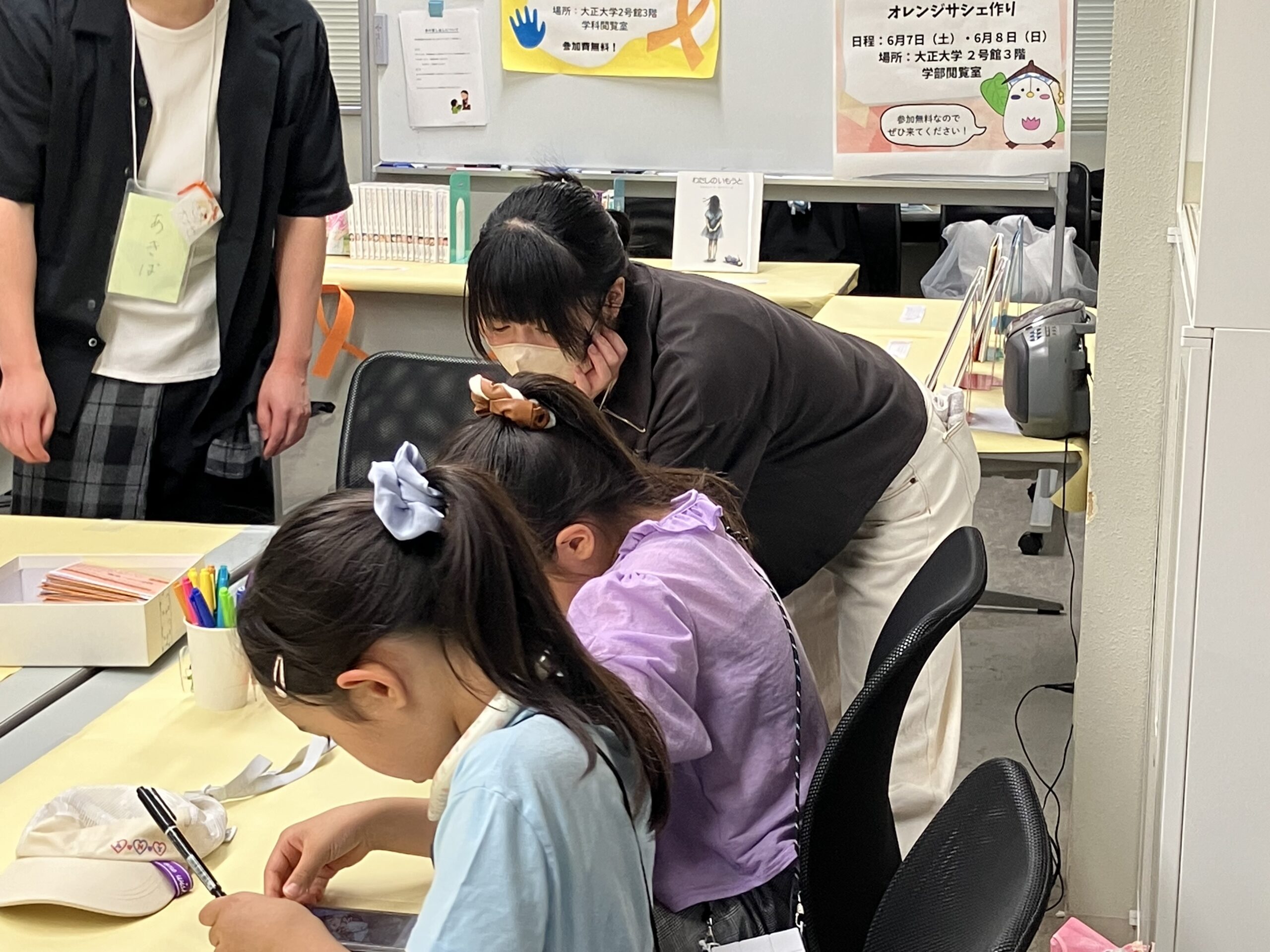 学科では10年以上オレンジリボン運動(子ども虐待のない社会の実現を目指す市民運動)に取り組んでおり、活動成果を発表する全国大会でも大賞を頂いています。今回、「オレンジリボン運動推進隊」は、その活動内容を掲示すると同時に、塗り絵やオレンジの香りのサシェ(匂い袋)を作るワークショップコーナーも設けました。「室友会」では、役員お薦めの漫画や絵本、専門書にお薦めポイントを書いて展示する傍ら、オレンジのストラップを付けたプラ板キーホルダー作りのワークショップを展開しました。