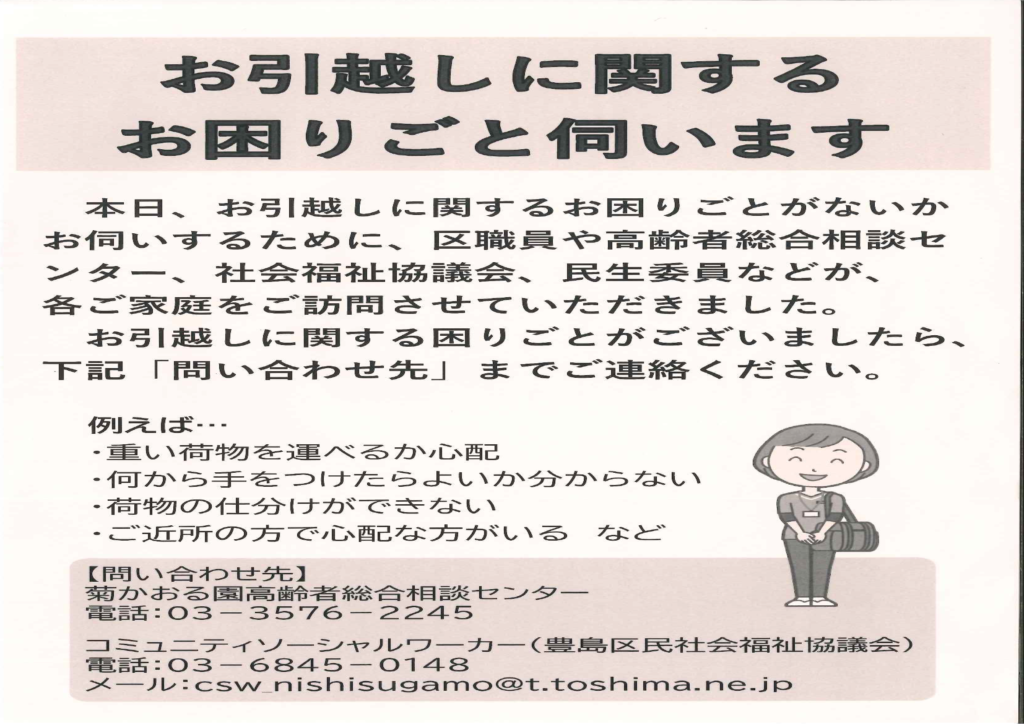 各班に分かれて、個別訪問を行い、引っ越しに向けた実態と困りごとを把握するために、64世帯を1軒ずつ訪問して回りました。留守宅には、引っ越しに関する困りごとがあったら問い合わせして欲しい旨のチラシを郵便受けに差し込みました。