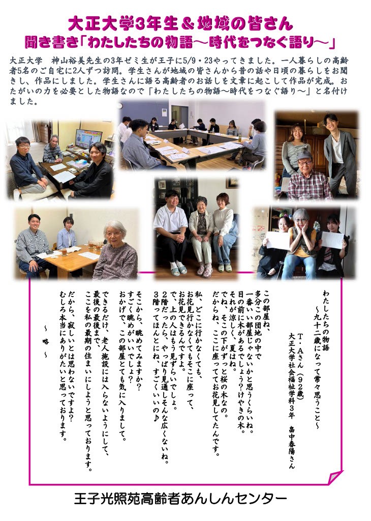 この企画は、王子光照苑地域包括支援センターの「わたしたちの物語~時代をつなぐ語り~」として企画されたもので、高齢者が人生を振り返ると共に、次世代にその歴史や生きる知恵を伝え、聴き手は高齢者の人生から学び、それらを文章化してお返しするというものです。地域包括支援センターのソーシャルワーカーによる高齢者と学生双方へのご配慮と調整のおかげで、高齢者にとっても学生にとっても、楽しい出会いと学びの場となりました。
