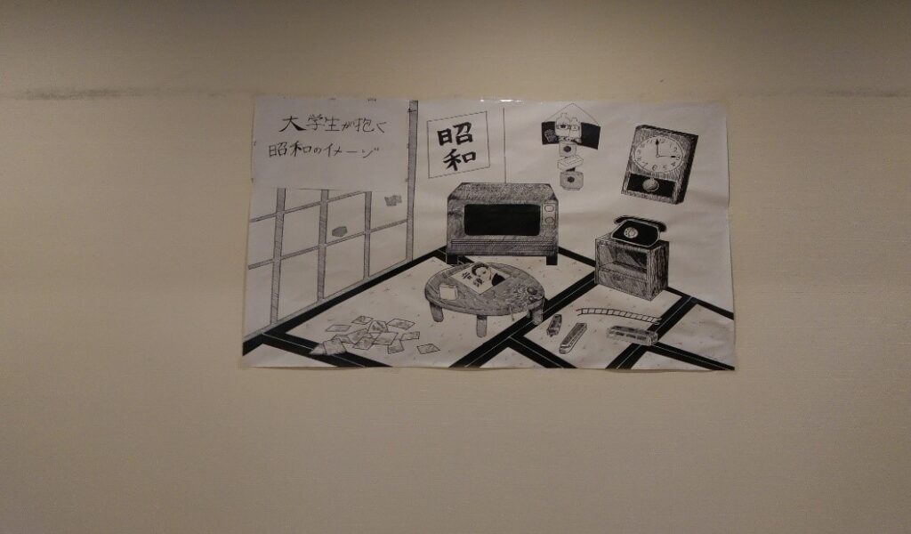このポスターは、学生に昭和をイメージすることばを2つあげてもらい、そのことばを盛り込んで、学生が描いたものです。当日は、志學亭に飾りました。