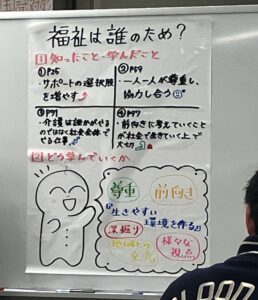 大正大学社会福祉学科が大好きで、専願で入学を決めた精鋭たちです。楽しくアイスブレイクをして同期となじんだ後で、課題図書だった、竹端寛(2025)『福祉は誰のため?』(ちくまプリマ―新書502)について、グループ学修で学びを深めました。