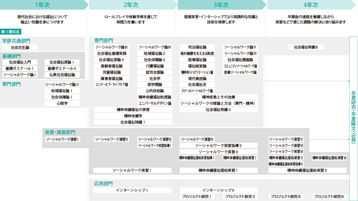学生が学びの主体となるように、アクティブラーニングを軸に授業を行います。1年次は現代社会における福祉について幅広い知識を習得します。それを土台に2年次は、ロールプレイや体験学習を通じて実践力を養います。3年次は現場実習・インターンシップでより実践的な知識と技術を身につけ、4年次に卒業研究や卒業論文に取り組みます。