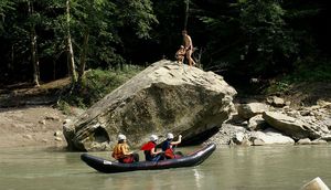 カヌーはもともと北米~オセアニア由来の小舟。これは1912年に撮影された、北米先住民(インディアン)、クワキュートル族がカヌーに乗りながら冬祭りの舞を踊っているところ。ちょっとわかりにくいですが、ハチ、雷神鳥(サンダーバード)、灰色熊(グリズリーベア―)に扮した踊り子たちが写っています。Edward S. Curtis撮影