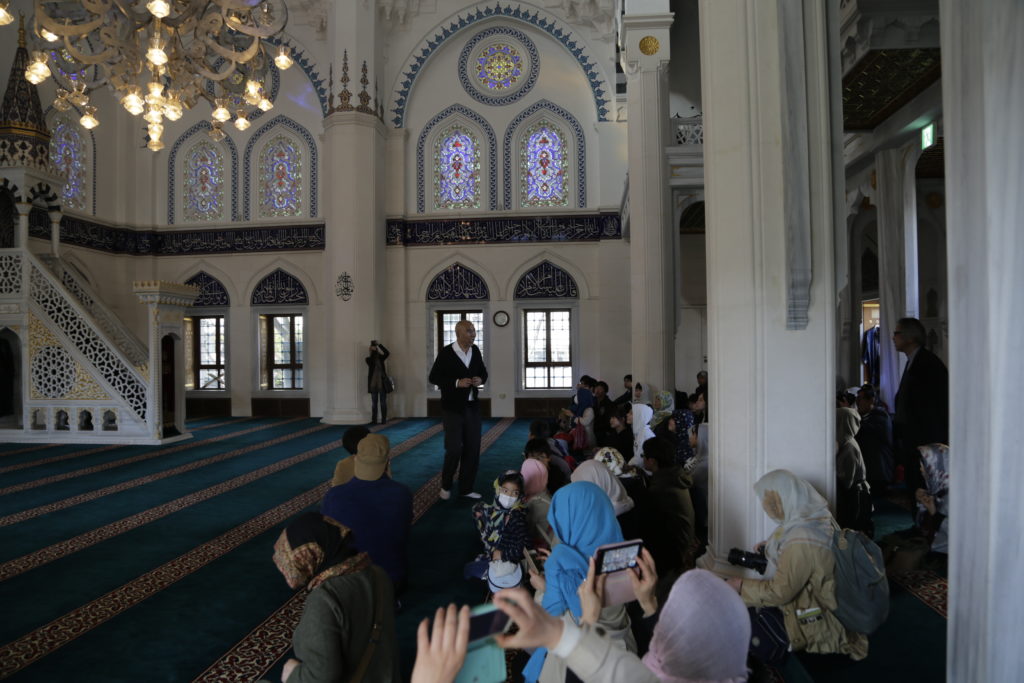 その後、礼拝堂の見学をさせていただきました。そして、トルコのブルーモスクを模した造りになっている東京ジャーミィの美しいカリグラフィーやステンドグラスなどの装飾の解説をしていただき、その背景にある宗教的な意義付けを学ぶことができました。
