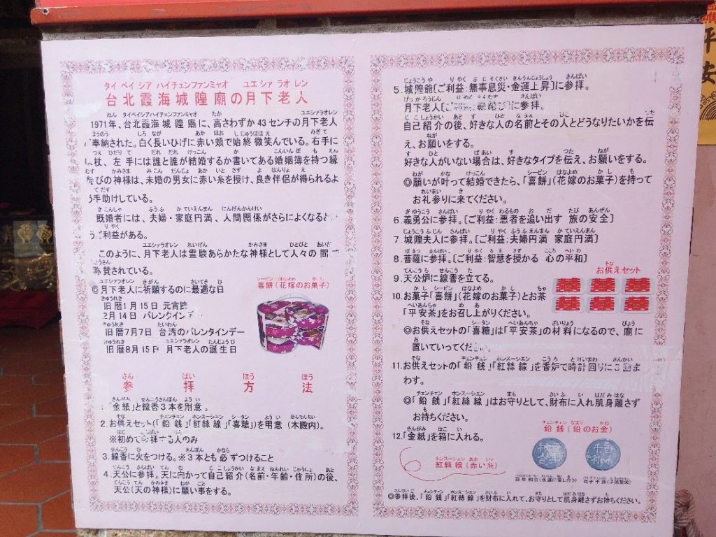 100年以上の歴史を持ち、縁結びの神様である月下老人を含めた600以上の神様を祀っています。霞海城隍廟の月下老人は立ち姿なのですが、古くからの言い伝えではこの立った状態の月下老人はご利益が高く、良縁をもたらすとされ、多くの未婚者がここへご縁を求めにやって来ます。既婚者へのご利益もあるそうです。