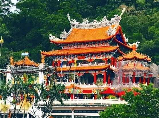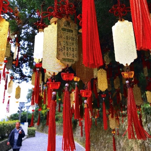 指南宮は、台湾道教の総本山ですが少し変わっていて、その120年の歴史の中で仏教、儒教も受け入れ、3つの宗教が1つの廟の中にあります。指南山の麓、海抜およそ300mに位置しており、動物園駅から猫空ロープウェイに揺られること30分ほどで指南宮駅に到着します。駅を出て凌霄寶殿へ向かう道沿いの木には、赤い飾りが印象的な絵馬がズラッとぶら下がっていました。