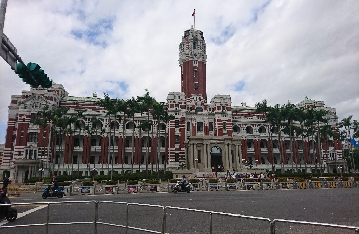 続いて徒歩で総統府へと向かいました。 日本統治時代の台湾総督府として、日本人の設計によって1919年に完成したこの建物は、ビクトリアン・ゴシックを基調に様々な建築様式が取り入れられた左右非対称の5階建てで、赤れんが造りの外観がとても目立っていました。