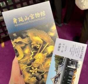本堂東側の階段を下ると、宝物館入り口があります。宝物館では現在「身延山霊宝展」が開催中です。こちらには、日蓮宗の御本尊である文字曼荼羅や、手刺繍で描かれた掛け軸の『刺繍十六羅漢図』など、身延山に関わる様々な収蔵品が展示されていました。文政年間の作品「身延山全地絵図」の中には、今回私たちが宿泊した麓坊さんの名前も見つけることができました。