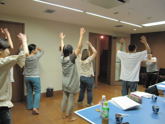 また夜には、全体ワークとして、担当者によるボディワークを行い、ホールボディフォーカシングと、インタラクティブフォーカシングを取り入れたような、オーセンティックムーブメントにより、体の感覚に触れる体験を深めました。