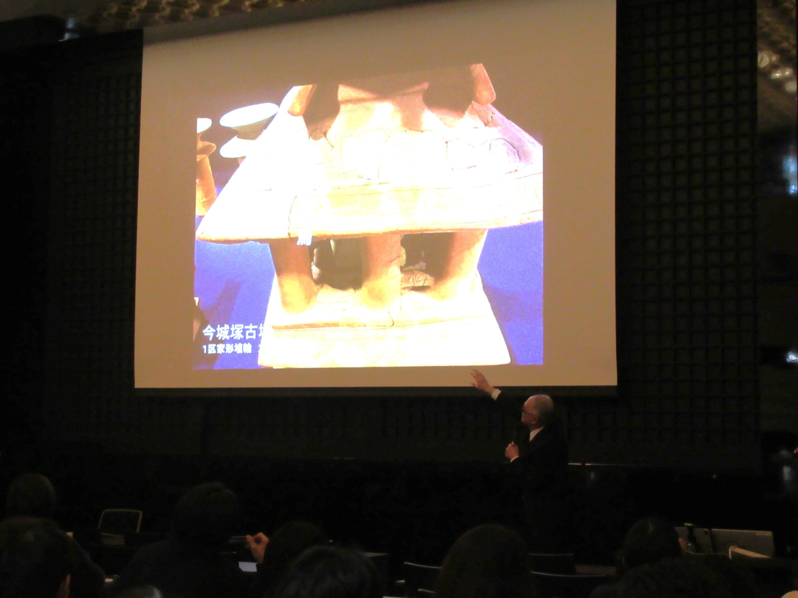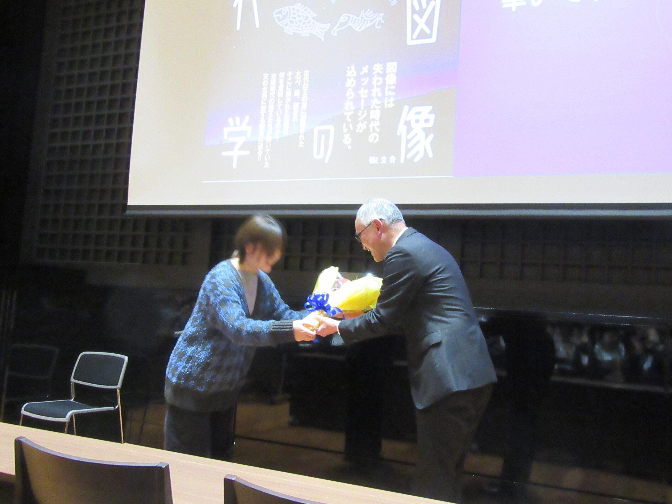 講義では古墳から出土した資料画像を提示し、比較検討しながら鉄剣や銅鏡に描かれた図像の意味を繙いていかれました。また、途中に挟まれる小話や思い出話に、会場からはつい笑い声が溢れていました。