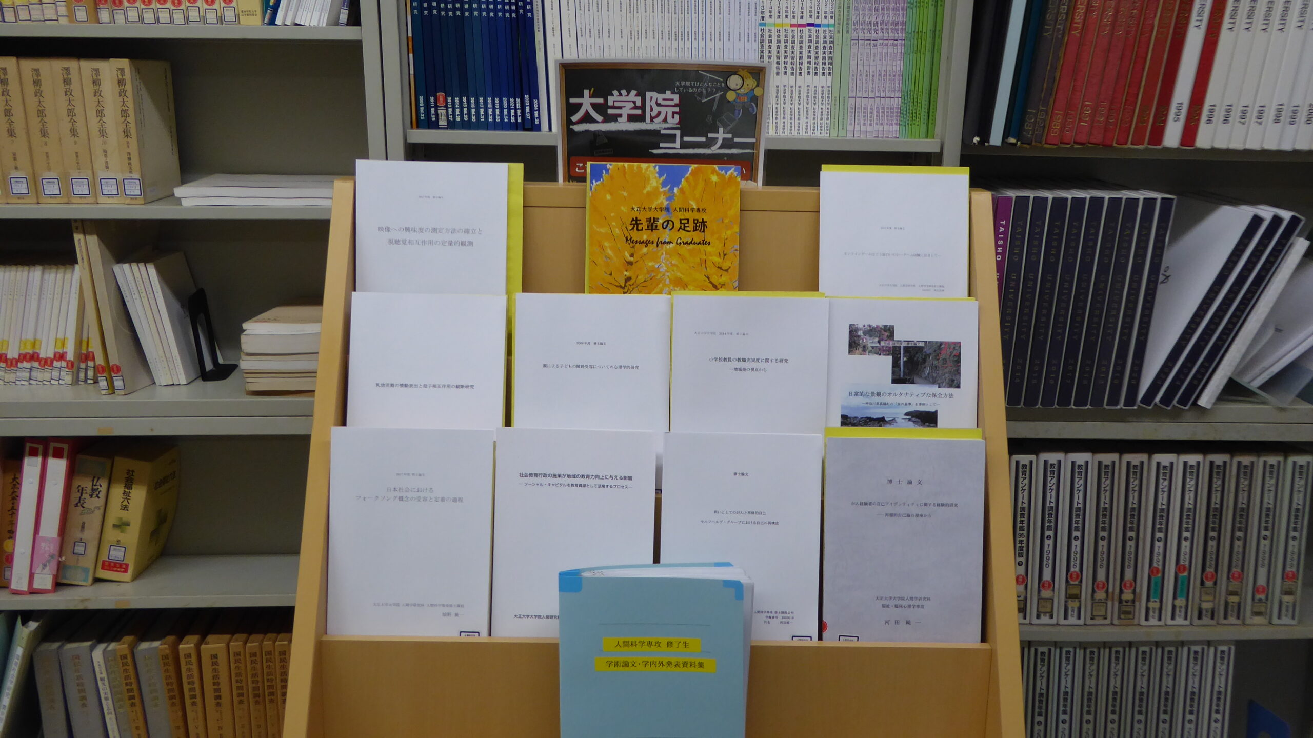 2号館4階の人間科学科書庫に、大学院人間科学専攻の修了生たちのメッセージを集めた冊子や、修士・博士の学位論文、学会誌等に掲載された学術論文、学会発表や学内発表会の資料などを配架した「院生コーナー」を開設しました。
